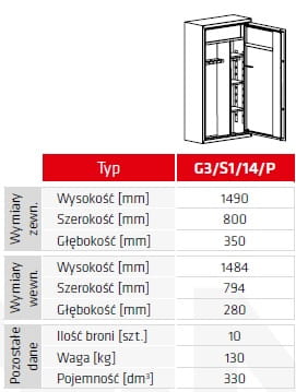 Szafa na broń wykonana w klasie S1 wg. normy PN-EN 14450:2006. Dostosowana do najnowszych wymagań dot. przechowywania broni.
