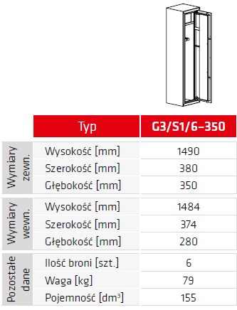 Wymiary wewnętrzne sejfu: 1484 x 374 x 280 mm (wys. x szer. x gł.)